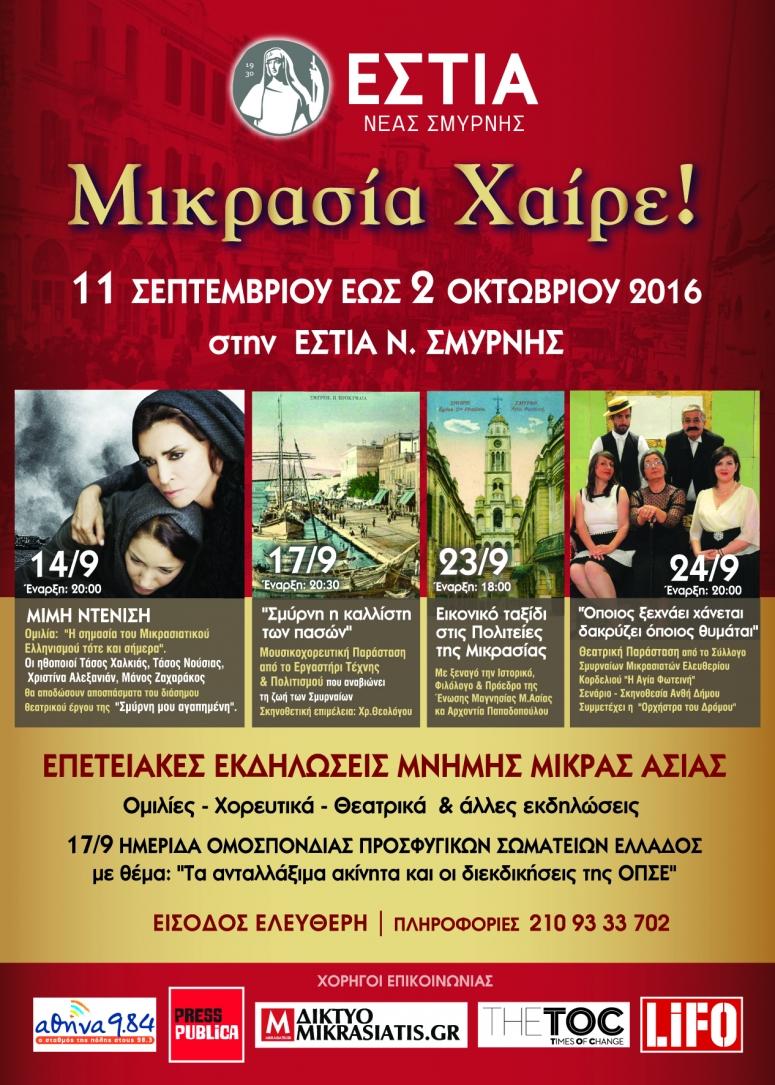 Προβολή του ντοκιμαντέρ «Η Χίμαιρα της Ιωνίας». Τι πραγματικά συνέβη τις δραματικές ημέρες της καταστροφής. Μιλάνε καθηγητές Πανεπιστημίου, ξένοι συγγραφείς και δημοσιογράφοι. Οι προβολές θα πραγματοποιηθούν στον 3ο όροφο, στην αίθουσα Επιμορφωτικών μαθημάτων. Πρωινή προβολή 10:00 και απογευματινή 19:00