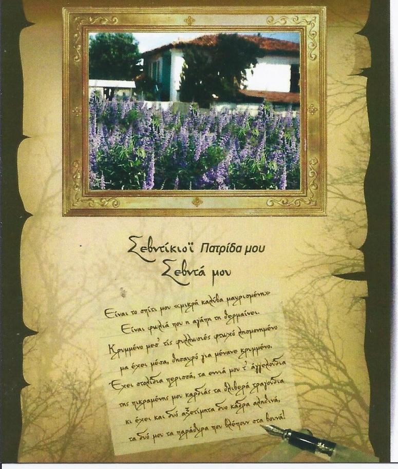 Θα παρουσιαστεί το βιβλίο της συγγραφέως κα Μαρίτσας Σαριντζιώτου - Σπύρου "Σεβντίκιοϊ Πατρίδα μου, Σεβντά μου". Για το βιβλίο θα μιλήσουν ο επίτιμος Αντιπρόεδρος της Εστίας Θεοφιλέστατος Επίσκοπος Ερυθρών κ.κ. Κύριλλος καθώς και η συγγραφέας. Θα ακουστούν μερικές σκέψεις από την Πρόεδρο του Συλλόγου Ανατολικής Αττικής κα Βούλα Παπαγεωργίου. Κατά τη διάρκεια της παρουσίασης θα απολαύσουμε φωτογραφίες της Σμύρνης πριν την καταστροφή με μουσική υπόκρουση έργων του συνθέτη Σταμάτη Σπανουδάκη.