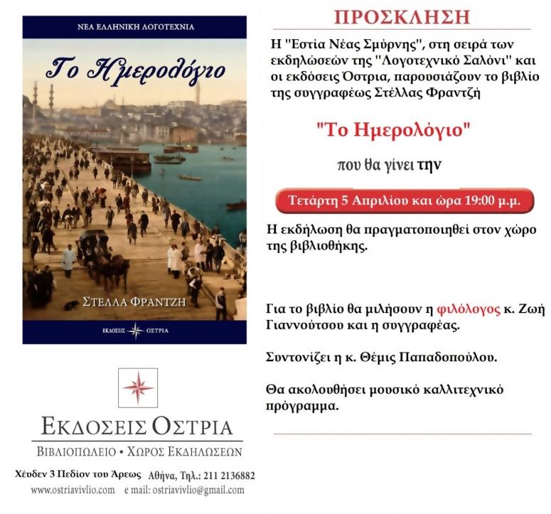 Λογοτεχνικό Σαλόνι. Θα παρουσιαστεί το βιβλίο της Συγγραφέως Στέλλας Φραντζή «Το ημερολόγιο» των εκδόσεων ΟΣΤΡΙΑ.