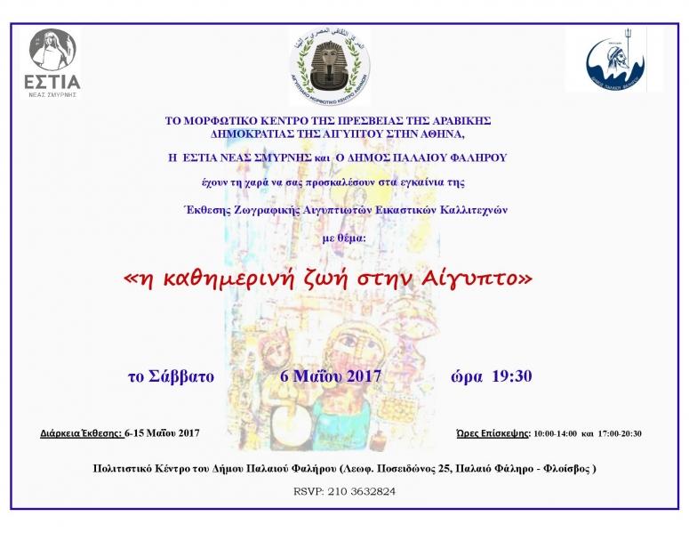 Η ΕΣΤΙΑ Νέας Σμύρνης, σε συνεργασία με το Μορφωτικό Κέντρο της Πρεσβείας της Αραβικής Δημοκρατίας της Αιγύπτου στην Αθήνα και ο Δήμος Παλαιού Φαλήρου σας προσκαλούν στα εγκαίνια της Έκθεσης Ζωγραφικής Αιγυπτιωτών Εικαστικών Καλλιτεχνών με θέμα: « Η καθημερινή ζωή στην Αίγυπτο».