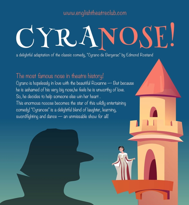 Στη σκηνή θα παρουσιάσουμε ένα από τα δημοφιλέστερα έργα του διεθνούς ρεπερτορίου, το αριστούργημα του Edmond Rostand «Cyrano». Μια ξεκαρδιστική κωμωδία, εμπνευσμένη από το κλασικό θεατρικό έργο, σε διασκευή για παιδιά και νέους «Cyranose!»